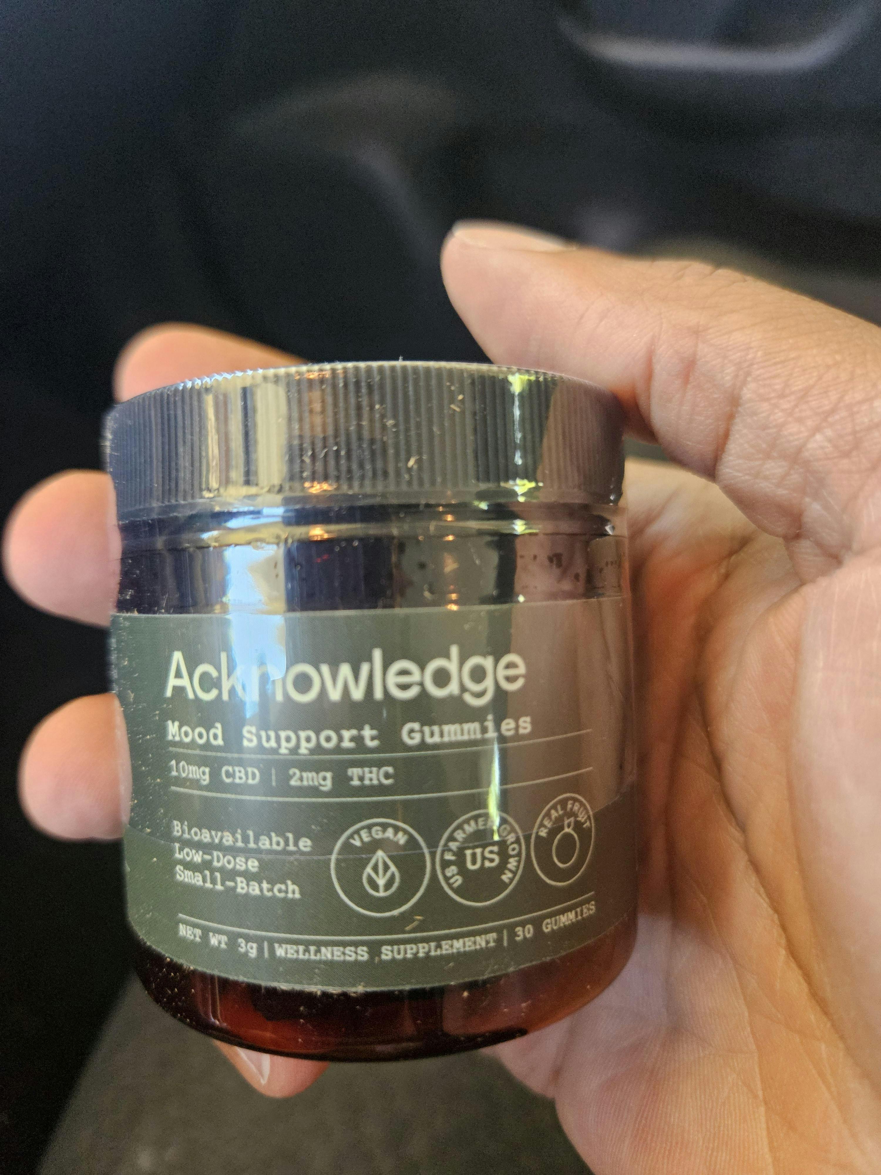 An image of Acknowledge Mood Support Gummies jar with two organic CBD+THC cubes on top.